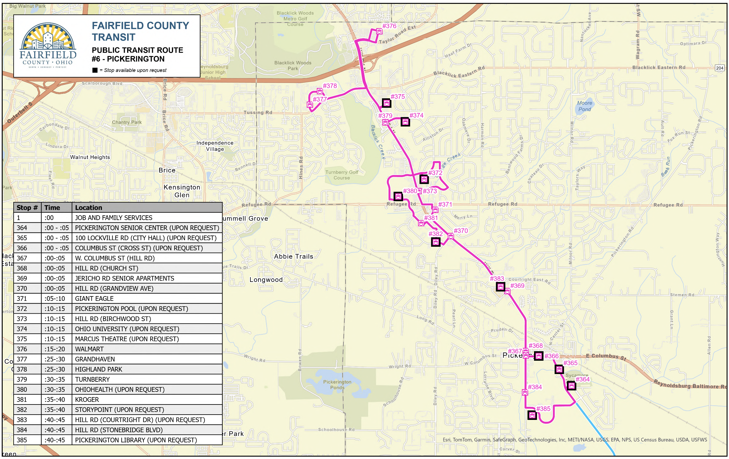 | 364-370 | :00 - :05 | Pickerington Senior Center*, City Hall*, Columbus St*, Hill Rd (Church St, Grandview Ave), Jericho Rd Apartments |