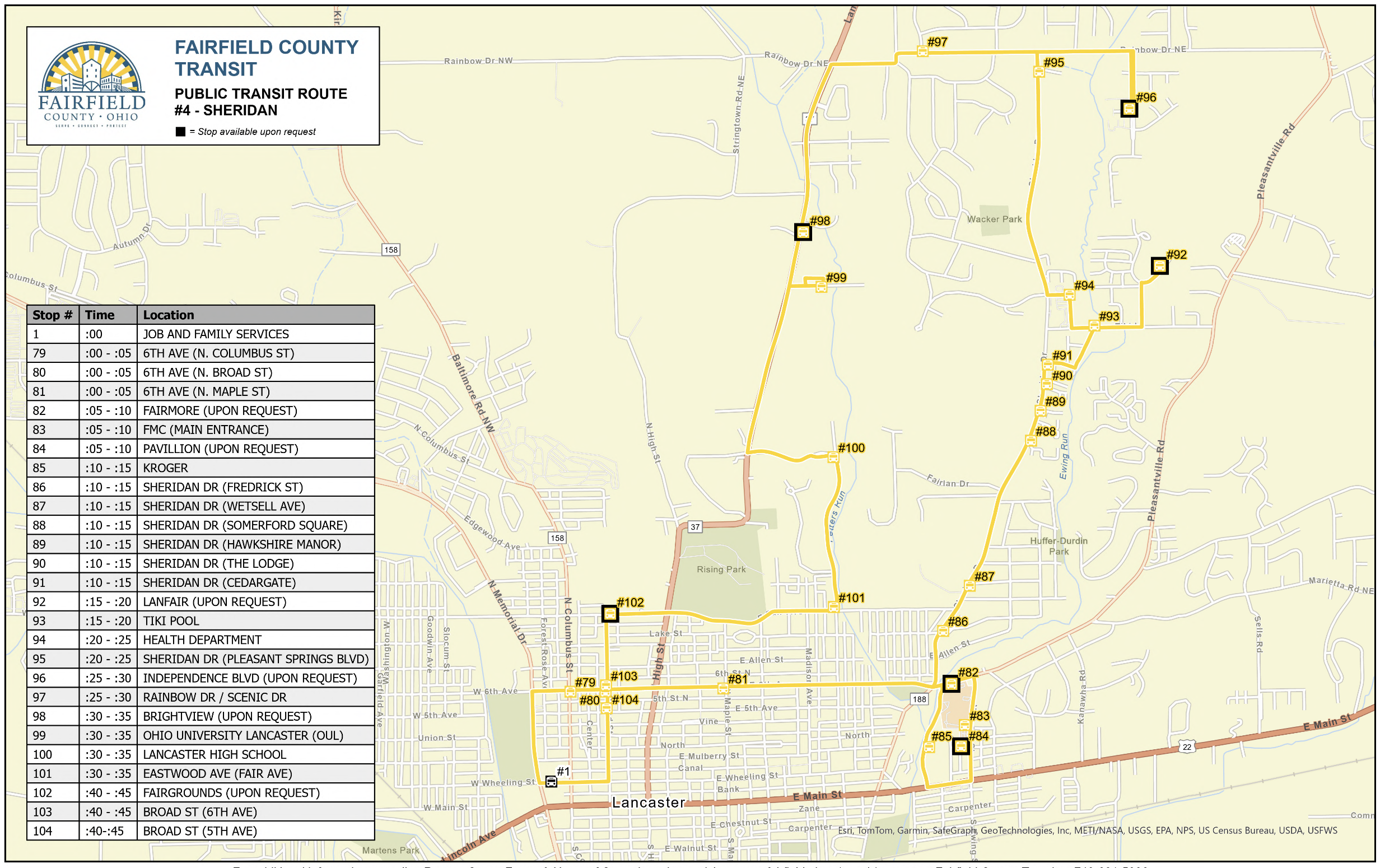 | 101-104 | :40 - :45 | High St (6th Ave, Union St, W. Mulberry St), W. Mulberry St (Columbus St) |